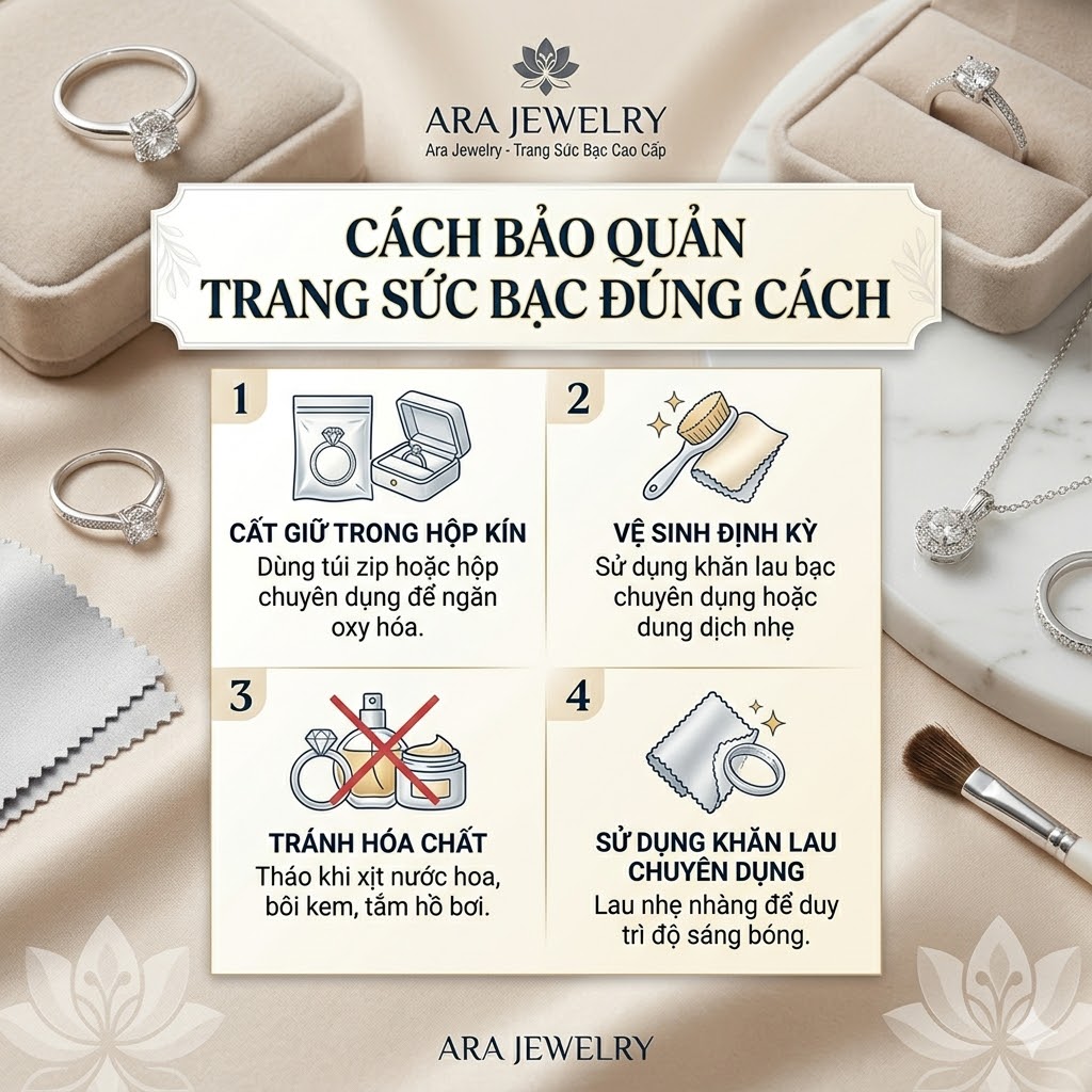 Bảo quản trang sức bạc đúng cách là yếu tố quan trọng giúp sản phẩm luôn giữ được vẻ sáng bóng như mới. Nếu không chăm sóc đúng cách, bạc rất dễ bị xỉn màu theo thời gian.